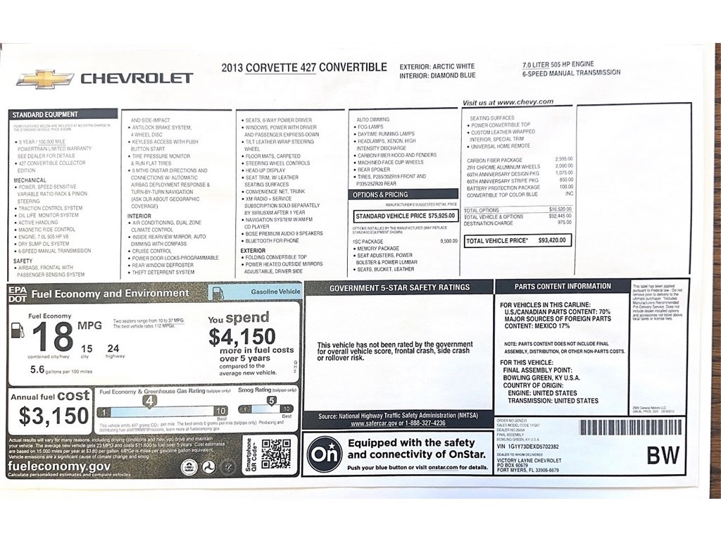 Power windows, Preferred Equipment Group 1SC, Rear Compartment Area Cargo Net, SIRIUSXM Satellite Radio, Speed control, Suede Steering Wheel w/Special Badge, Tilt steering wheel, Traction control, Universal Home Remote, Z06 Carbon Fiber Package.